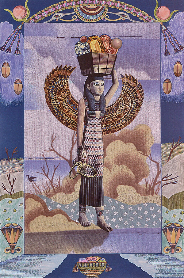 A winged Egyptian figure takes tiny steps forward on a path leading from the sea with a treasure basket of precious jewels balanced perfectly upon its head. Even its wings are encrusted with jewels. While one hand steadies the basket, the other holds two rings of gold.