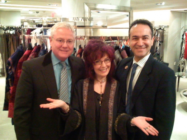 I regularly show my Spiritual Couture at Bergdorf Goodman in NYC. Here I am with Todd, a good friend and the head of Personal Shopping, and sales associate, Ramin at a recent showing of my fashions.